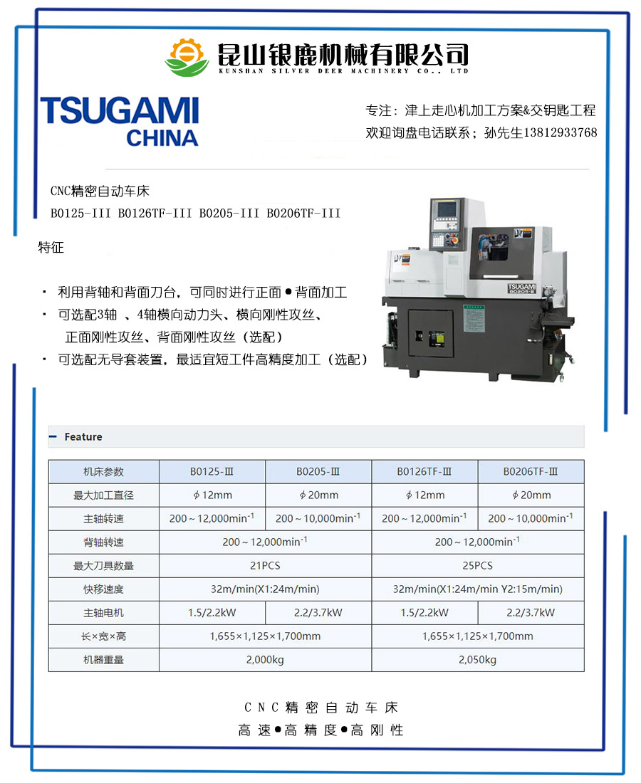 津上B0125和B0205共用床身、這款機(jī)一般情況下我們不賣:如果加工7mm以上產(chǎn)品我們建議買B0205-III價(jià)格差別不大、可加工范圍小。我們?cè)卺槍?duì)1-3mm產(chǎn)品時(shí)會(huì)推薦用這款機(jī)、搭配冠通小料機(jī)使用??梢赃x擇配導(dǎo)套、側(cè)面動(dòng)力刀頭、背軸、功能和B0205相當(dāng),同樣可以實(shí)現(xiàn)主背軸同步加工、互不干擾。