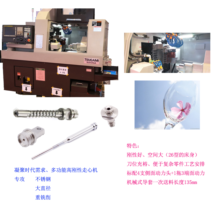 日本津上S205A-III專攻不銹鋼、鈦合金、大直徑、重銑削零件量產(chǎn)加工。新一代醫(yī)療精密五金用走心機,搭配4支側(cè)面動力頭以及2支可插拔動力接口,可以選裝1拖3的雙向端面動力頭或者1拖3端面斜孔動力頭,新型機械式旋轉(zhuǎn)導(dǎo)套一次送料長度達到135mm,并可以視實際需求選配電導(dǎo)套達到210mm一次送料長度??梢詾獒t(yī)療精密五金行業(yè)客戶提供產(chǎn)品加工方案以及交鑰匙工程服務(wù),為客戶優(yōu)質(zhì)完成產(chǎn)品保駕護航。歡迎垂詢!